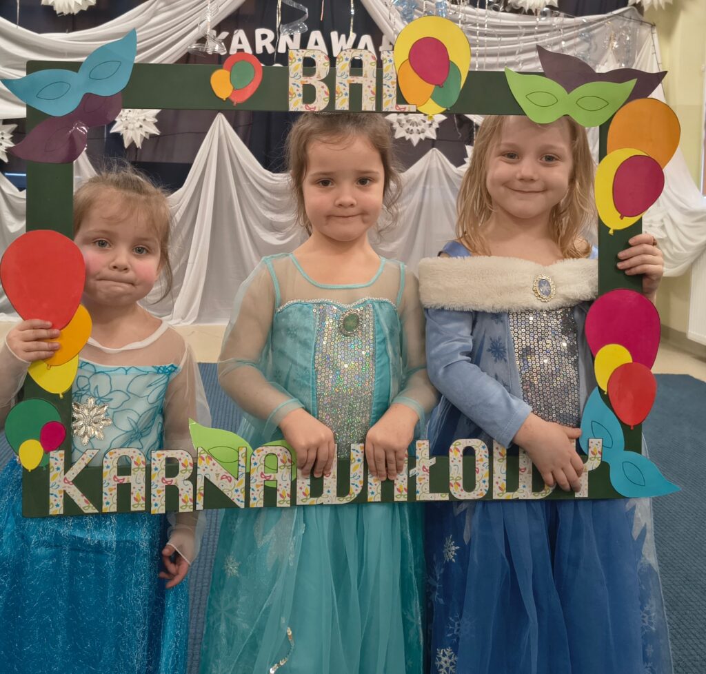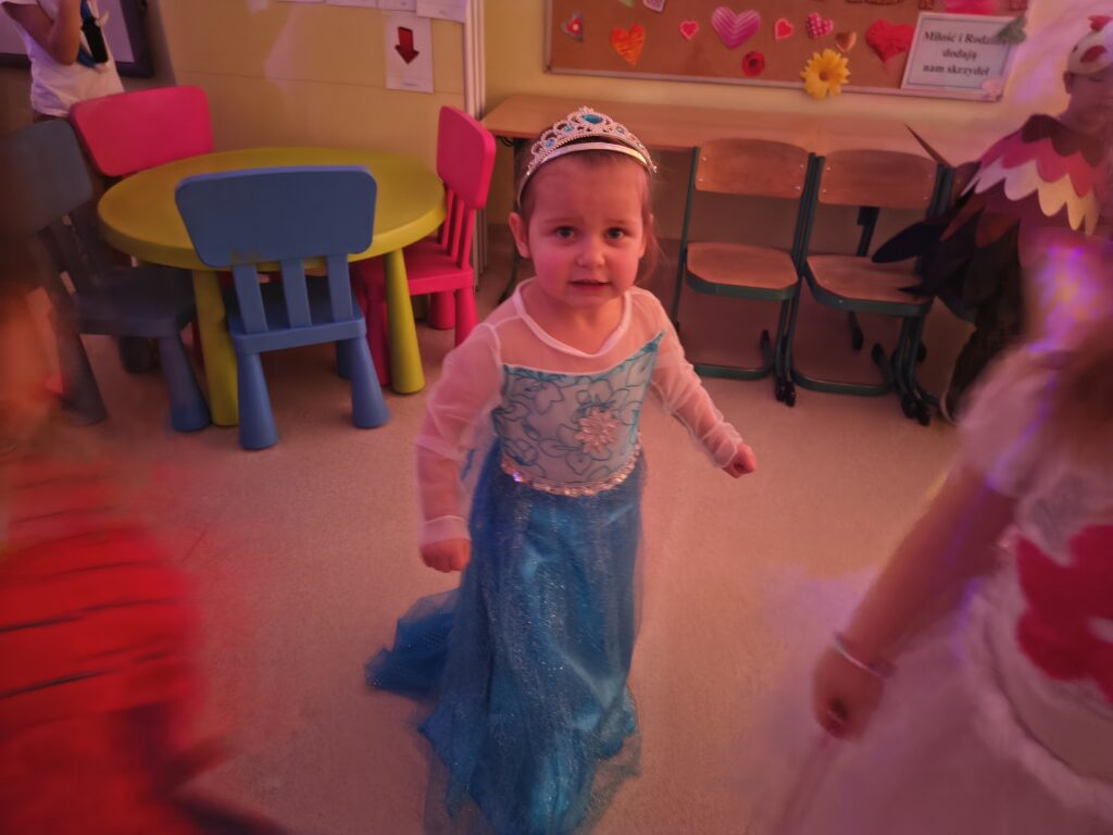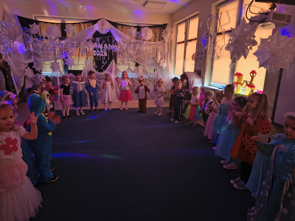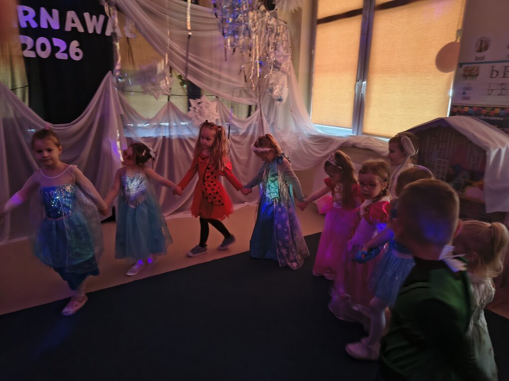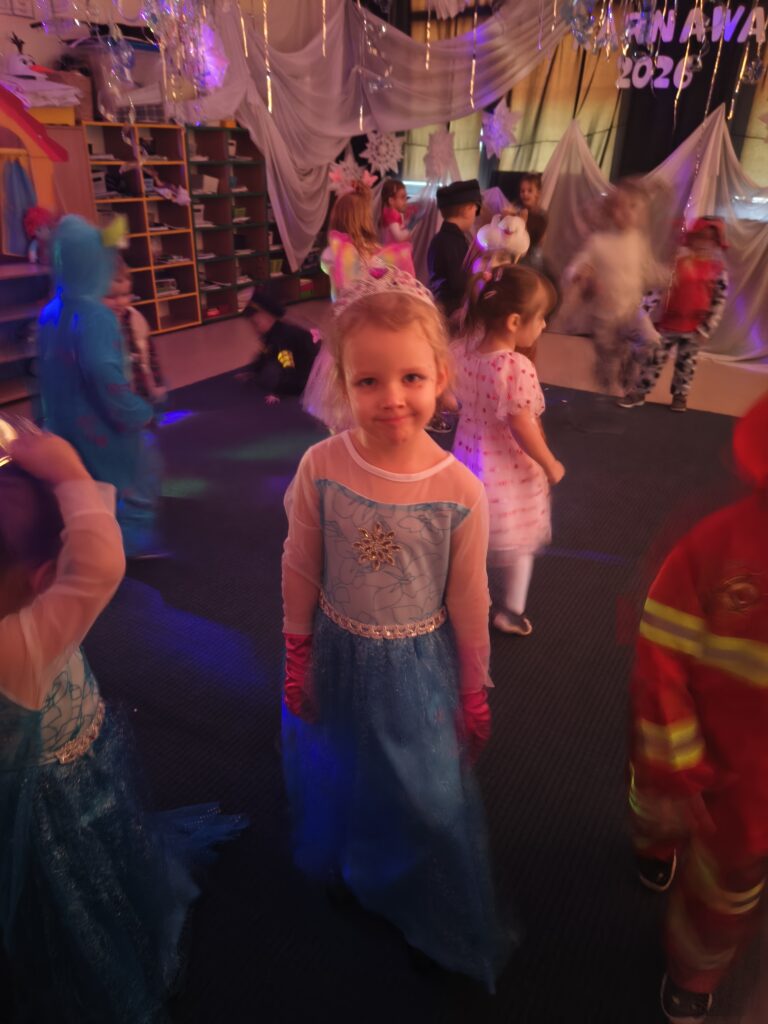 17 lutego w naszym przedszkolu odbył się wyjątkowy bal karnawałowy — Bal w Krainie Lodu. Atmosfera była bajkowa, a sala zamieniła się w prawdziwe zimowe królestwo. Dziewczynki najczęściej wybierały stroje Elzy, ale nie zabrakło też innych, przeróżnych kostiumów, które dodały wydarzeniu kolorów i fantazji. Każde dziecko wyglądało jak bohater własnej opowieści. Podczas balu nie brakowało tańców, zabaw muzyczno‑ruchowych i wspólnej radości. Dzieci bawiły się świetnie, a uśmiechy nie znikały z ich twarzy przez cały dzień.