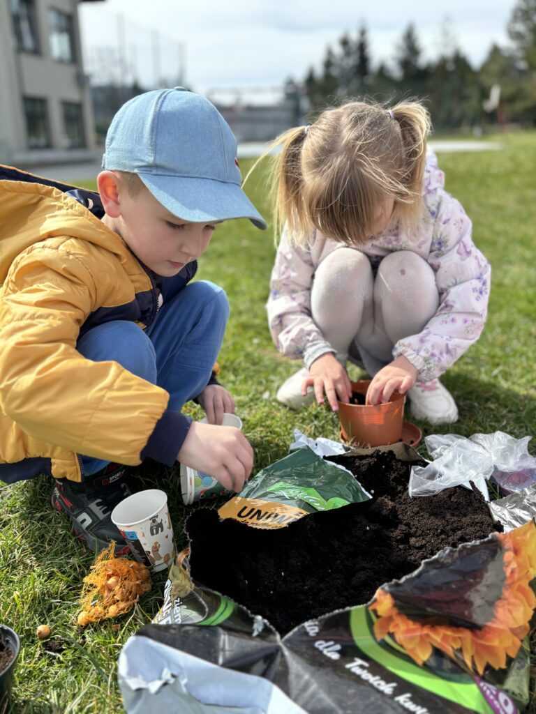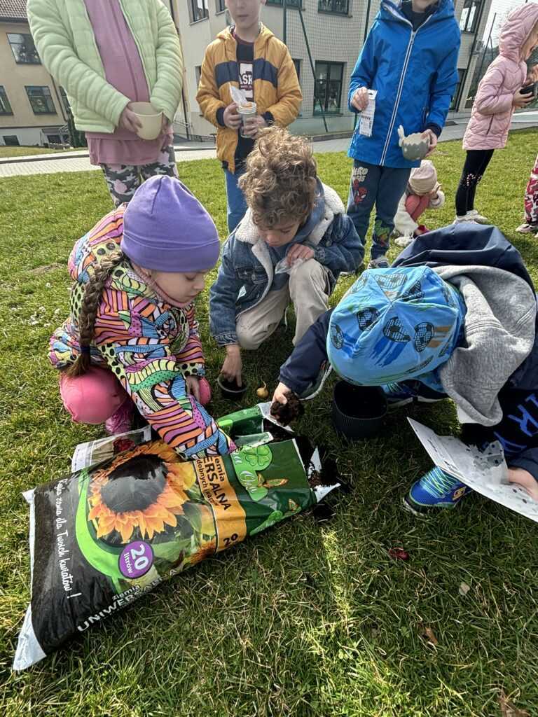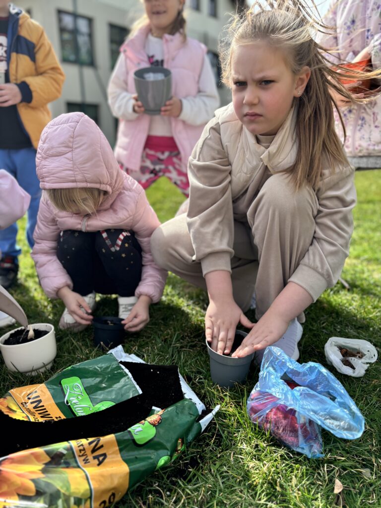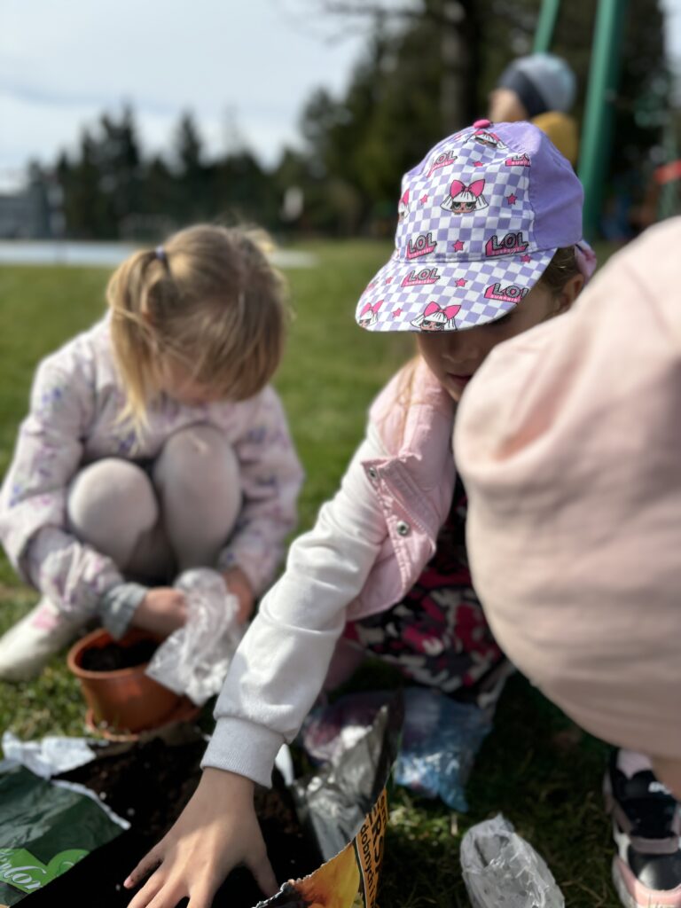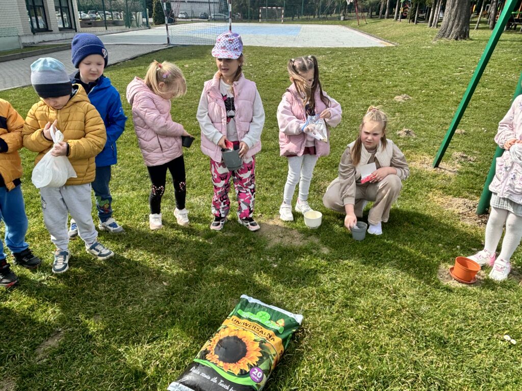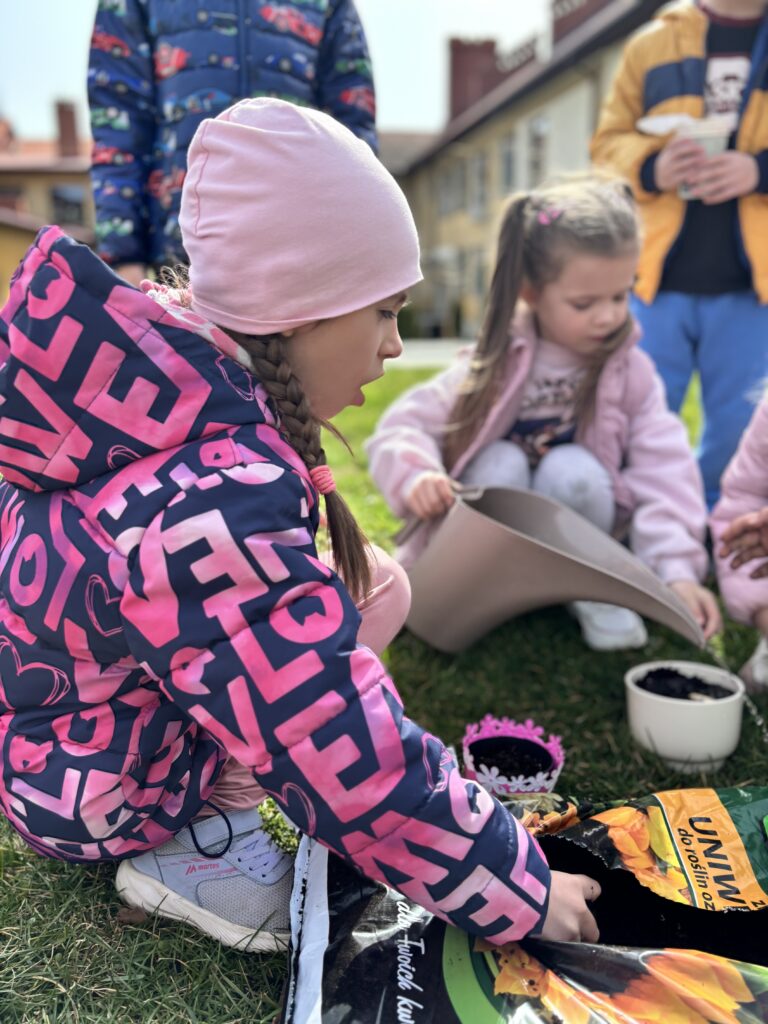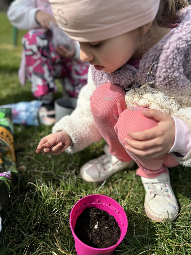 W promieniach ciepłego słońca i przy delikatnym, wiosennym wietrze przedszkolaki z wielkim zaangażowaniem sadziły cebulki kwiatowe do doniczek. Małe rączki dzielnie wsypywały ziemię, robiły dołki i z ogromną ostrożnością układały cebulki, jakby każda z nich była małym skarbem. Nie zabrakło uśmiechów, ciekawych pytań i radości z pracy na świeżym powietrzu. Teraz pozostaje nam tylko czekać… Mamy nadzieję, że już wkrótce nasze doniczki rozkwitną bogactwem barw, a dzieci będą mogły z dumą podziwiać efekty swojej pracy. To był piękny, wiosenny dzień pełen nauki, zabawy i kontaktu z naturą.