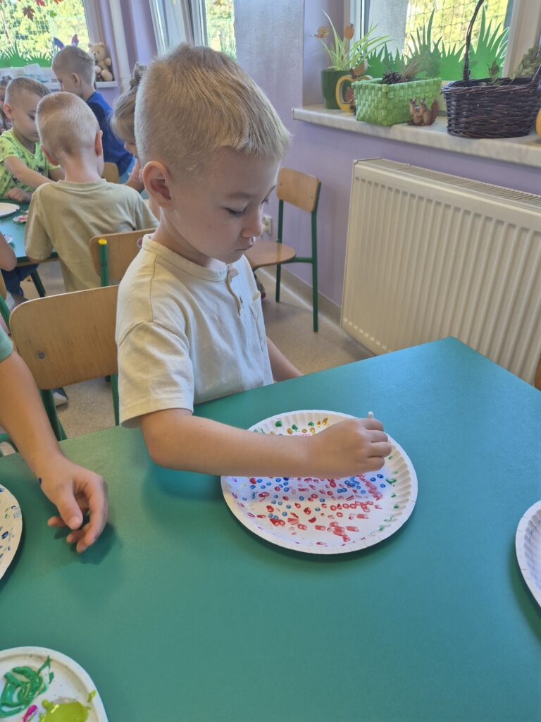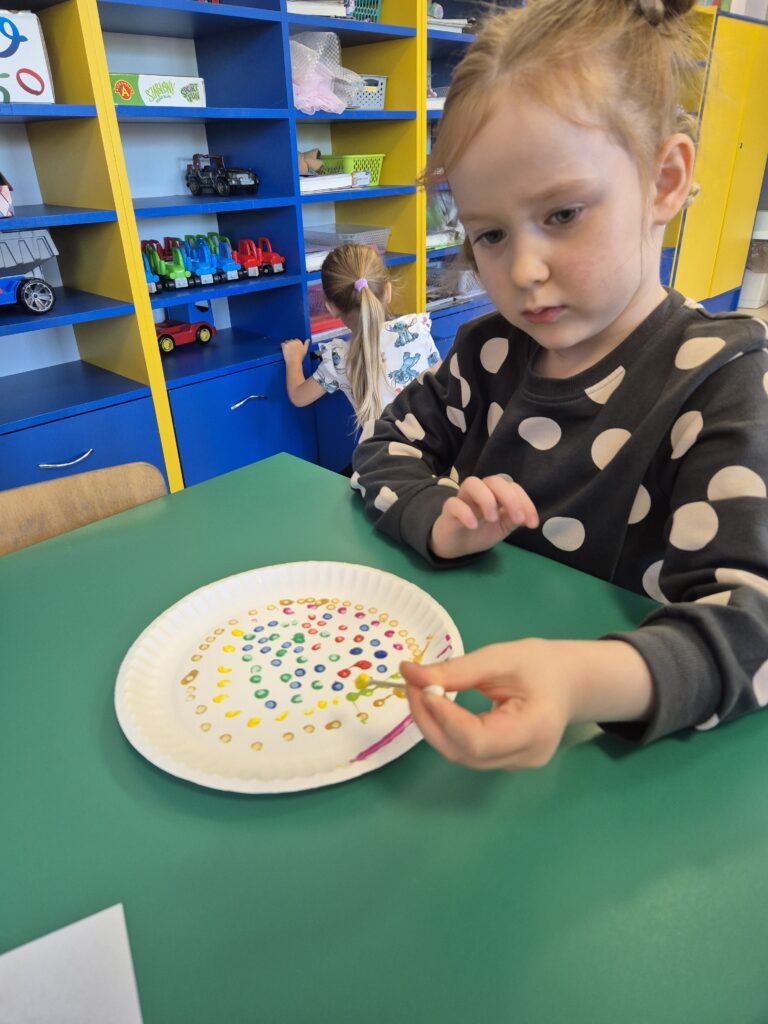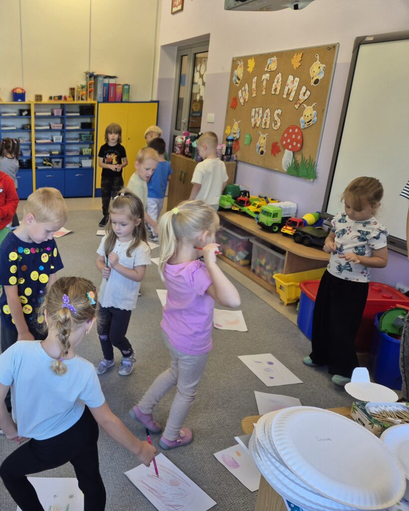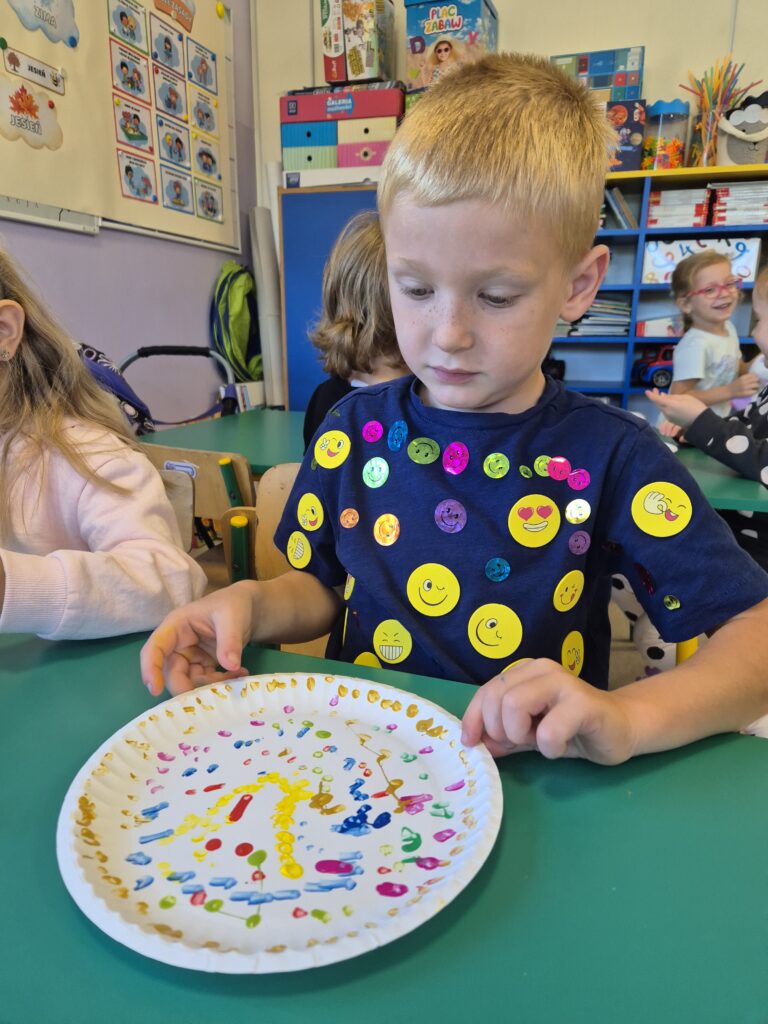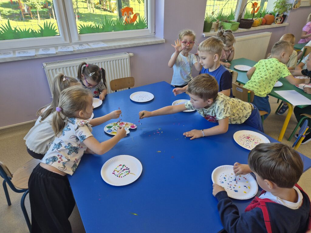 15 września w naszym przedszkolu obchodziliśmy Międzynarodowy Dzień Kropki – święto kreatywności, odwagi i wiary we własne możliwości. Tego dnia w naszej sali pojawiło się mnóstwo kolorowych kropek, a dzieci uczestniczyły w ciekawych i twórczych zabawach. Przedszkolaki malowały farbami barwne kompozycje z kropek, tworząc niepowtarzalne dzieła sztuki. Z plasteliny powstawały wesołe, wypukłe kropki i obrazki pełne fantazji. Dzieci mogły też obejrzeć film o Vashti – dziewczynce, która dzięki jednej małej kropce odkryła swój talent i uwierzyła w siebie. Historia ta pokazała wszystkim, że każdy z nas ma w sobie wyjątkowe możliwości. Był to dzień pełen radości, zabawy i odkrywania, że nawet z małej kropki może powstać coś wielkiego.