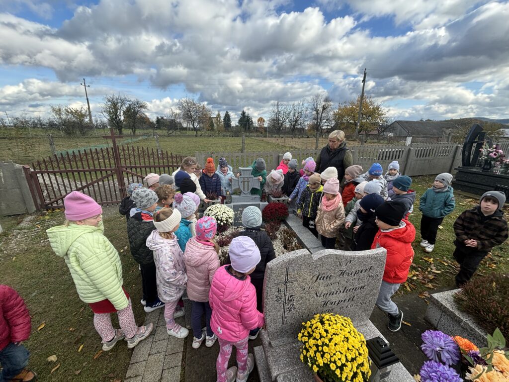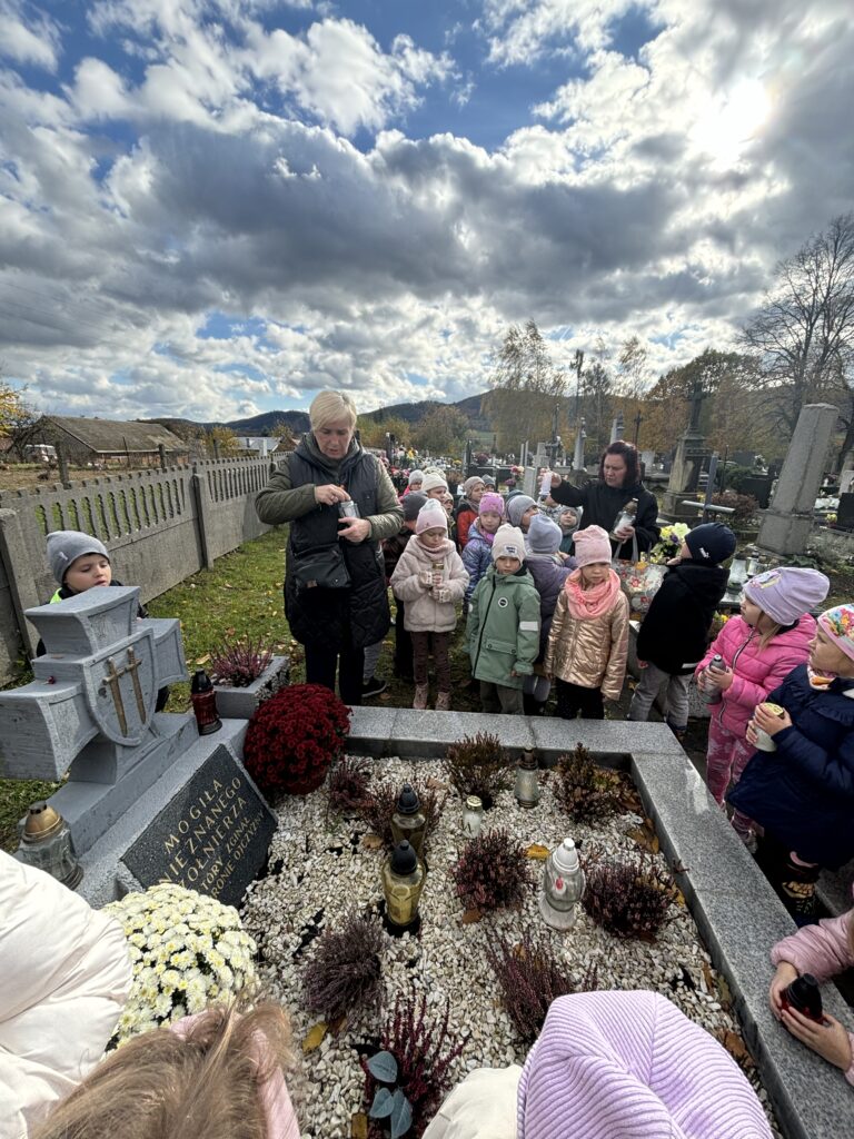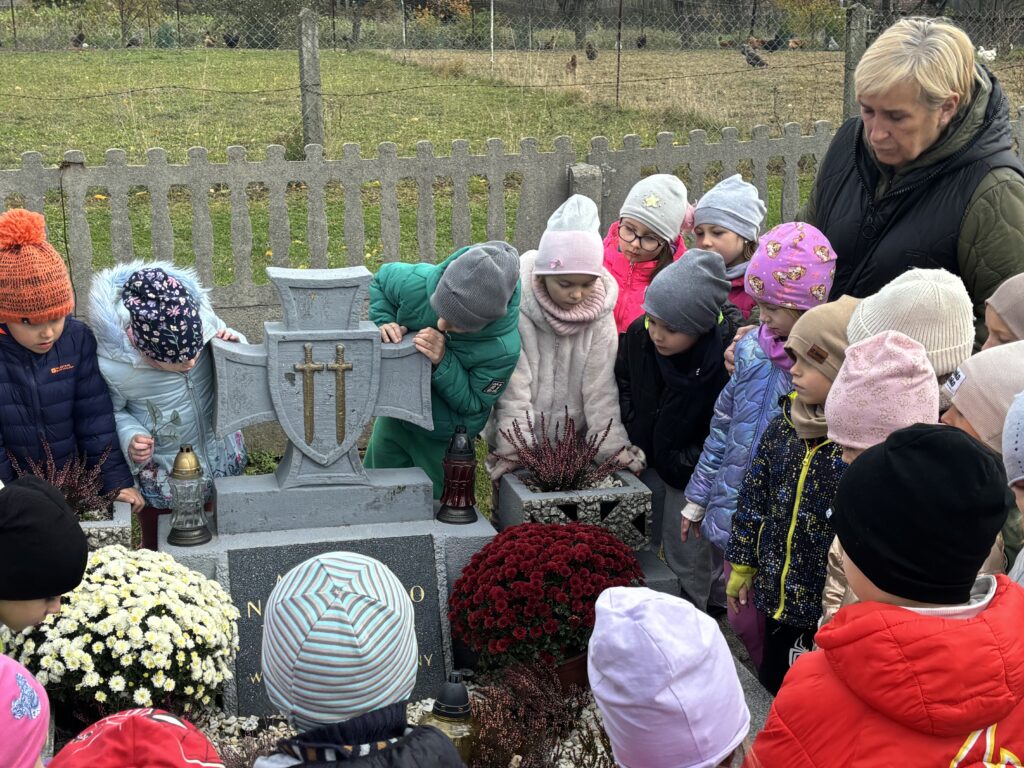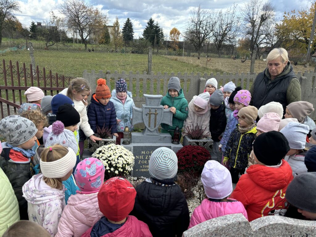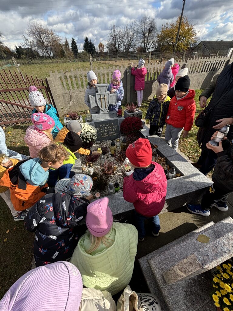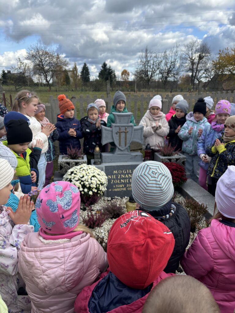 29 października, najstarsze przedszkolaki wybrały się na cmentarz parafialny aby odwiedzić grób Nieznanego Żołnierza. Celem wyjścia było kształtowanie postawy szacunku wobec osób, które oddały życie za ojczyznę, oraz pielęgnowanie pamięci o bohaterach narodowych. Wyjście było dla dzieci cenną lekcją patriotyzmu, refleksji i wdzięczności. Przedszkolaki wróciły do placówki z poczuciem dumy i zrozumienia, że pamięć o bohaterach jest naszym wspólnym obowiązkiem.