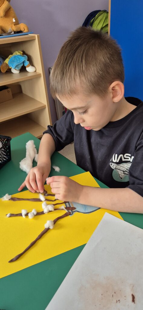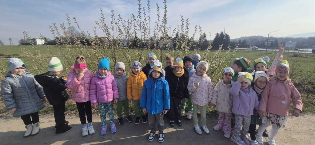 Zainspirowani wiadomością od Wiosny, wyruszyliśmy na poszukiwanie jej zwiastunów. Dzieci z ogromnym zaangażowaniem obserwowały otoczenie, wypatrując pierwszych pąków, zielonych listków oraz śpiewających ptaków. Każde odkrycie sprawiało im wiele radości i utwierdzało nas w przekonaniu, że wiosna naprawdę już do nas zawitała.