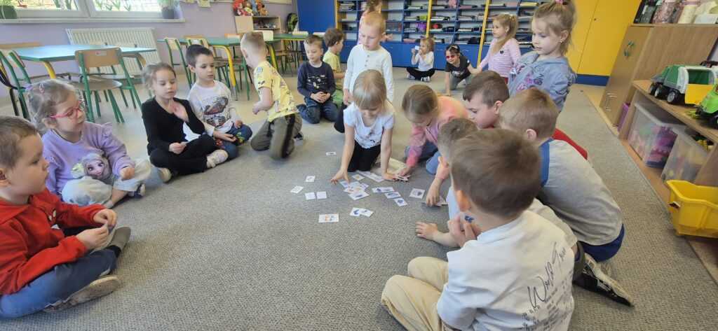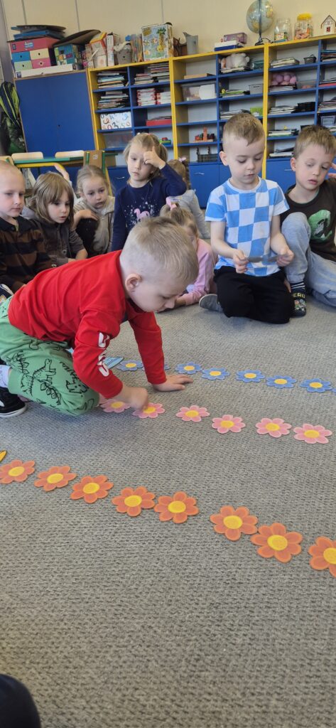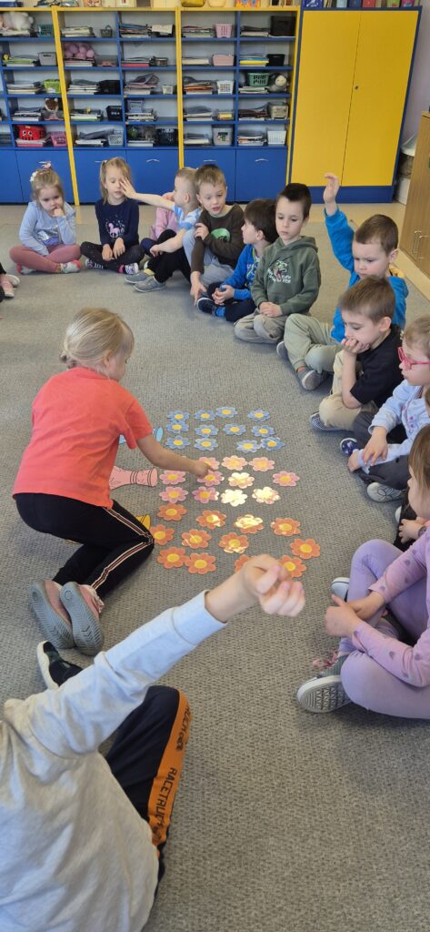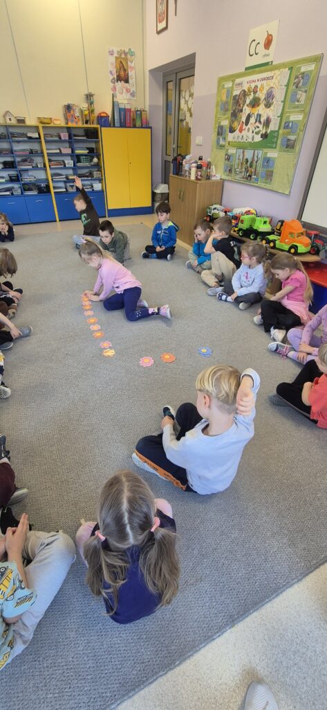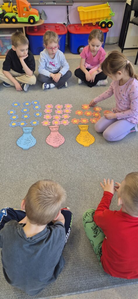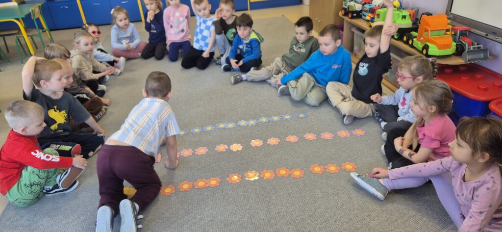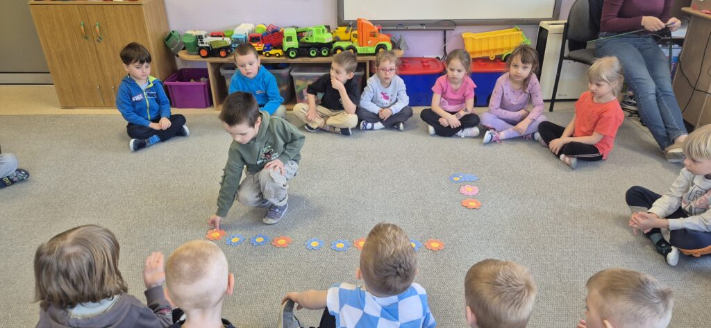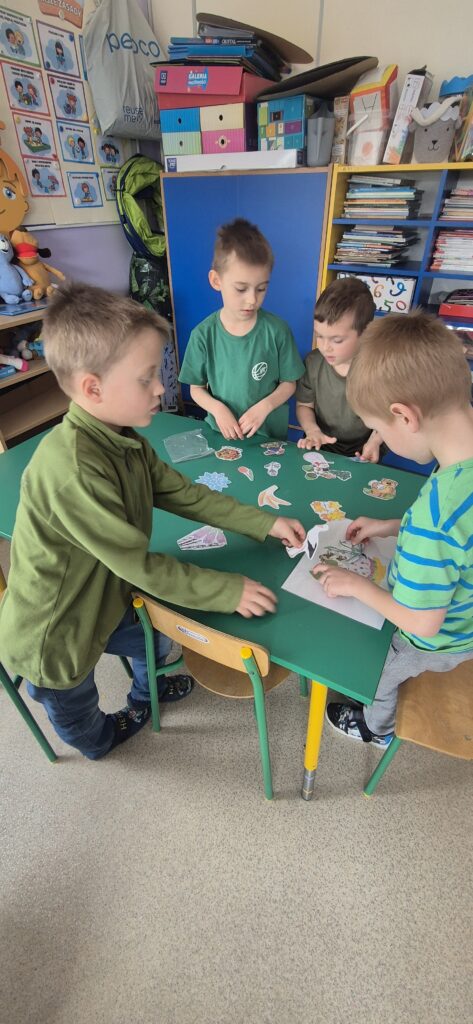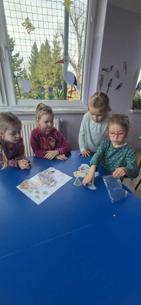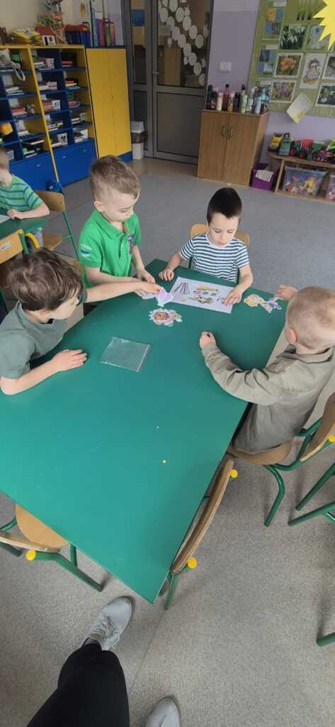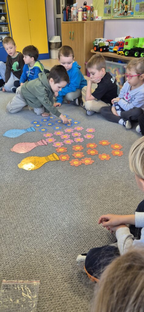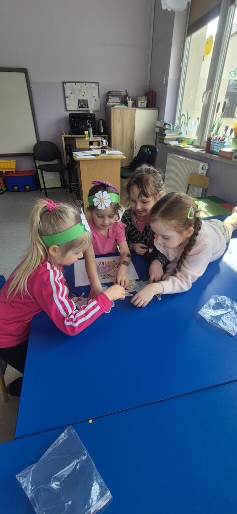 Po powrocie do przedszkola na dzieci czekały kolejne zadania przygotowane przez Panią Wiosnę. Przedszkolaki pracowały w grupach, rozwiązując zagadki i zadania matematyczne dostosowane do ich wieku. Współpraca, dzielenie się pomysłami i wspólne poszukiwanie rozwiązań były doskonałą okazją do rozwijania umiejętności społecznych.