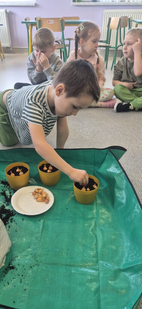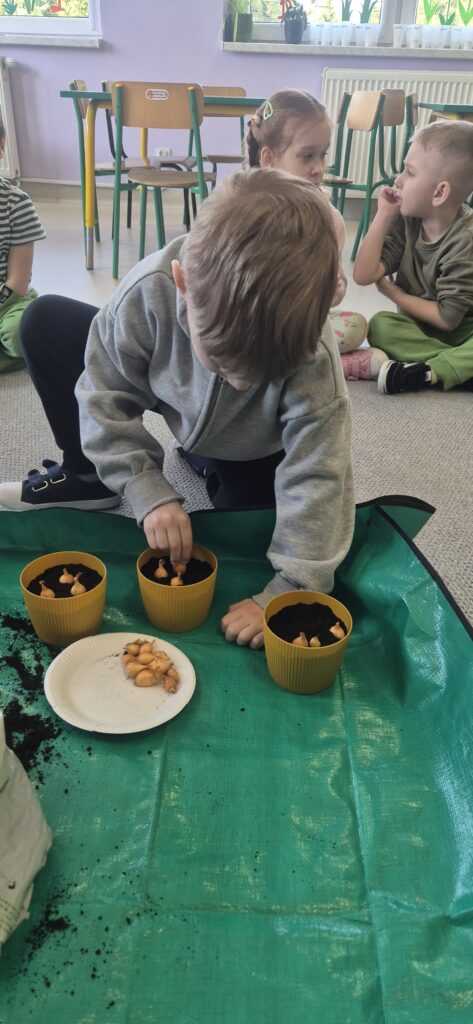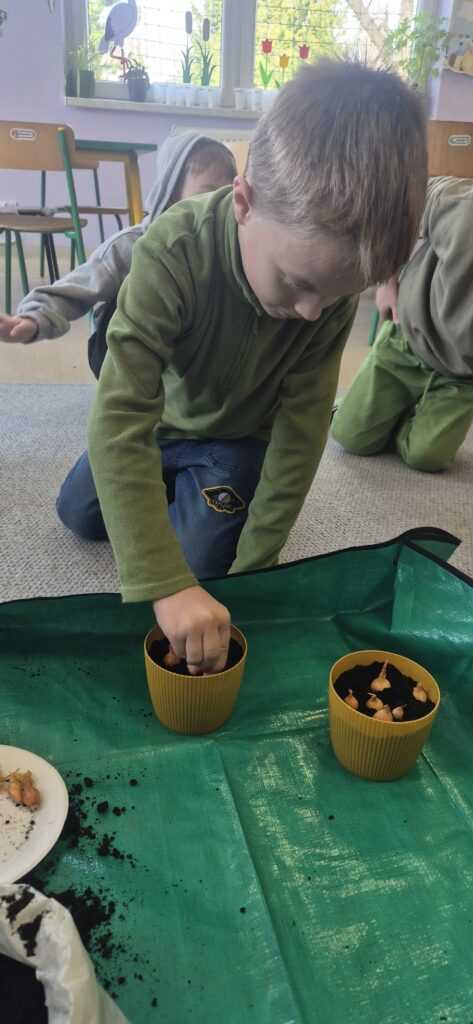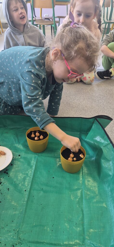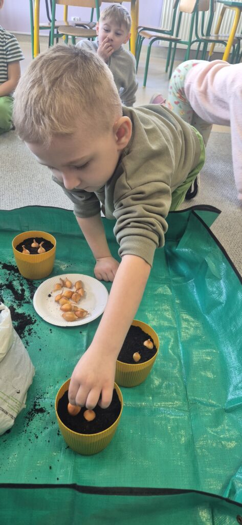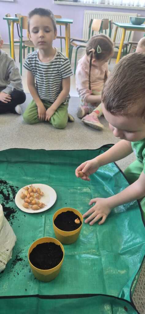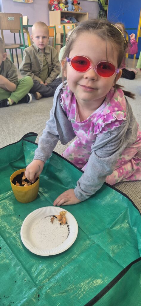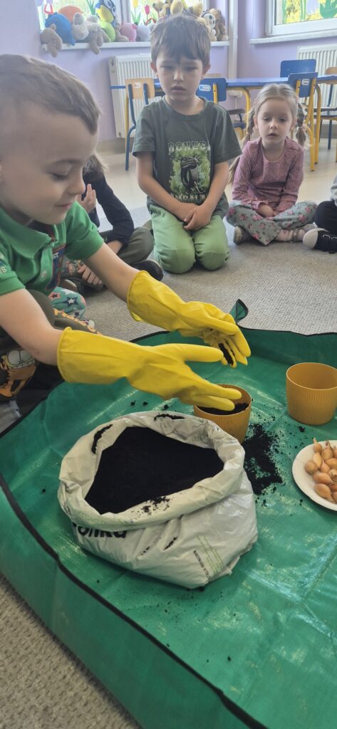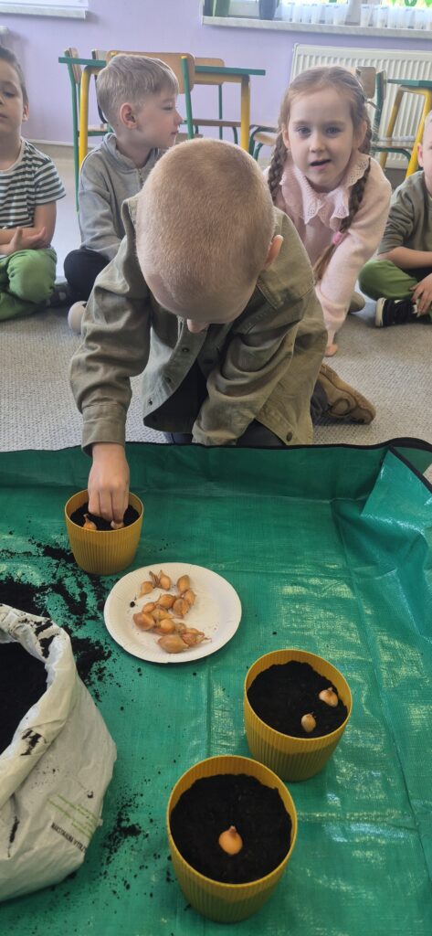Nie zabrakło również zajęć praktycznych. Dzieci samodzielnie sadziły fasolki oraz cebulki, ucząc się przy tym, jak dbać o rośliny i obserwować ich wzrost.