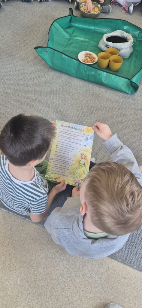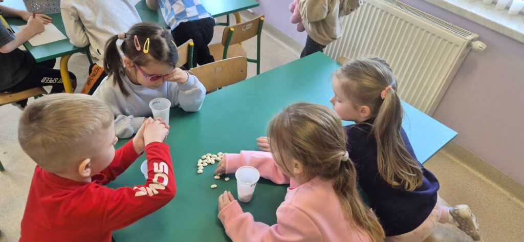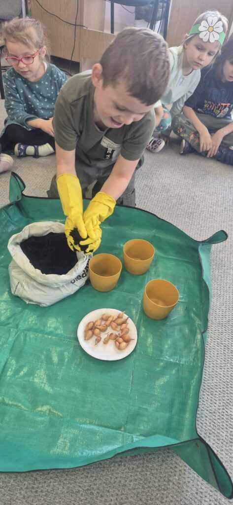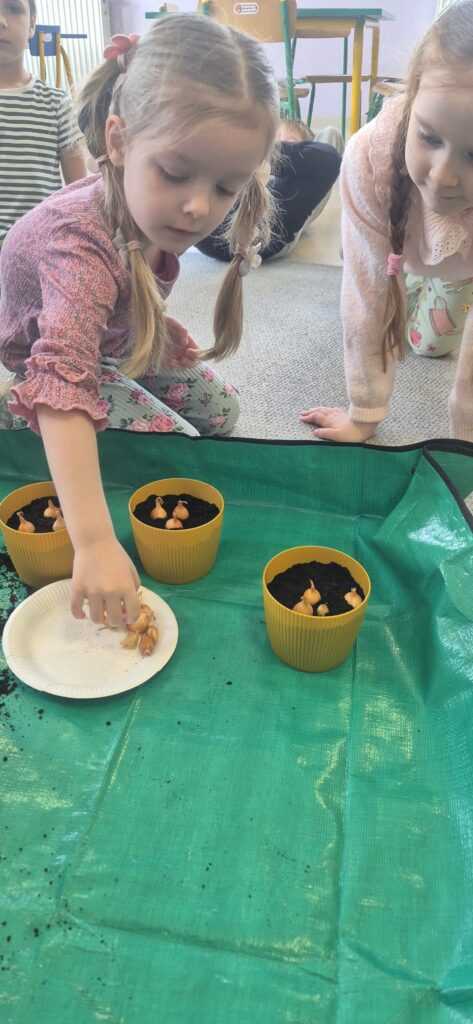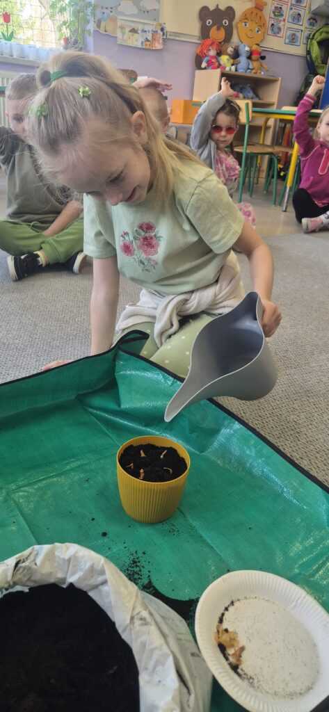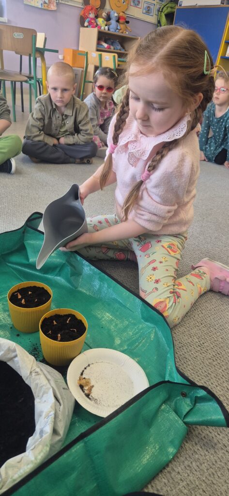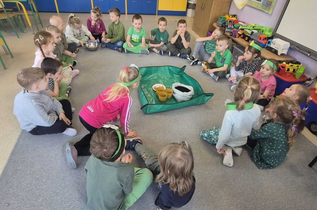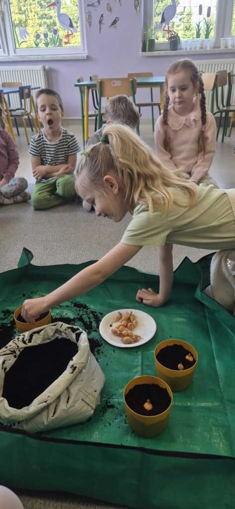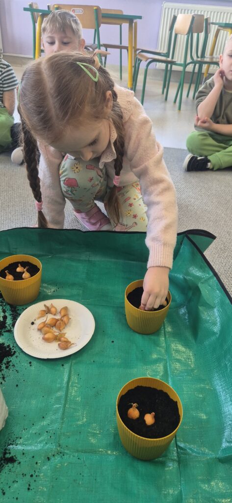 Nie zabrakło również zajęć praktycznych. Dzieci samodzielnie sadziły fasolki oraz cebulki, ucząc się przy tym, jak dbać o rośliny i obserwować ich wzrost.