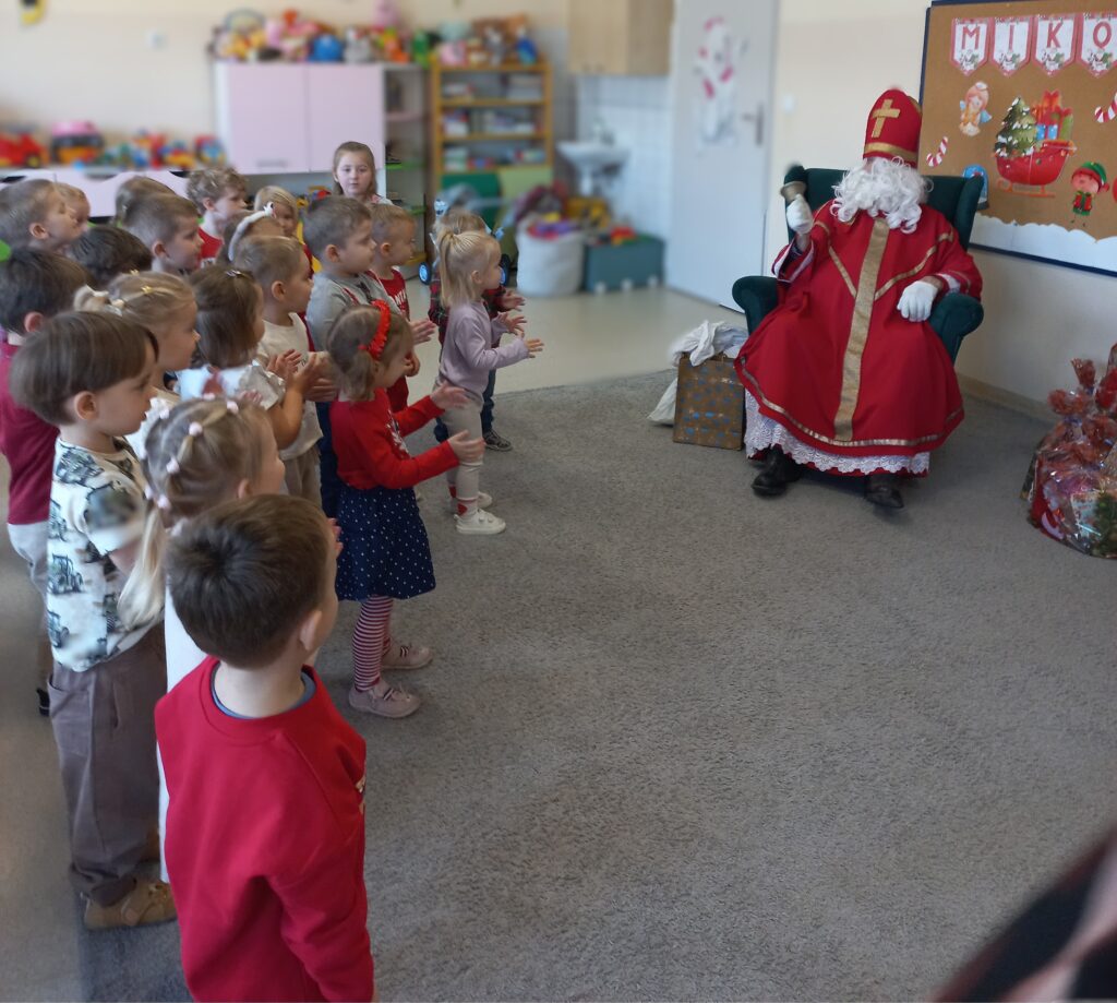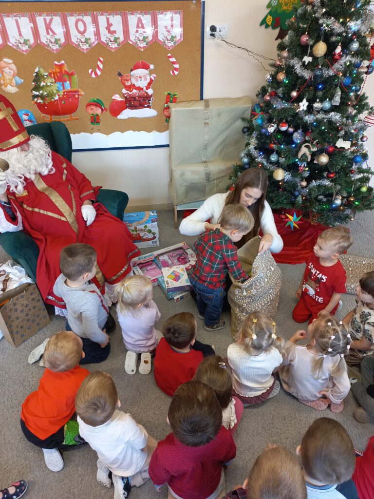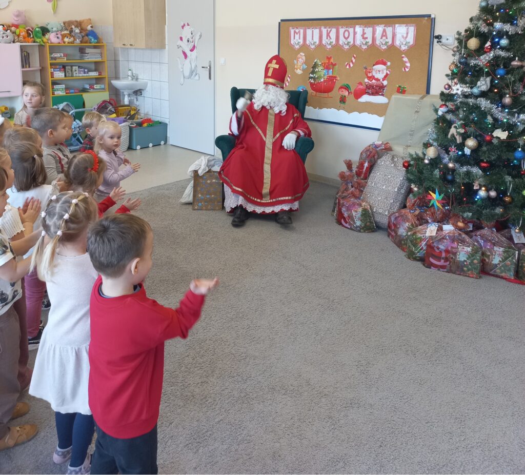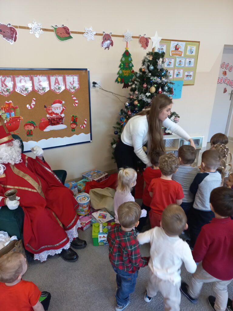 W naszej grupie odbyła się długo wyczekiwana wizyta Świętego Mikołaja. Dzieci z wielką radością powitały wyjątkowego gościa, który przyniósł prezent dla każdego przedszkolaka, a także worki pełne zabawek dla całej grupy, przeznaczone do zabawy w sali przedszkolnej.