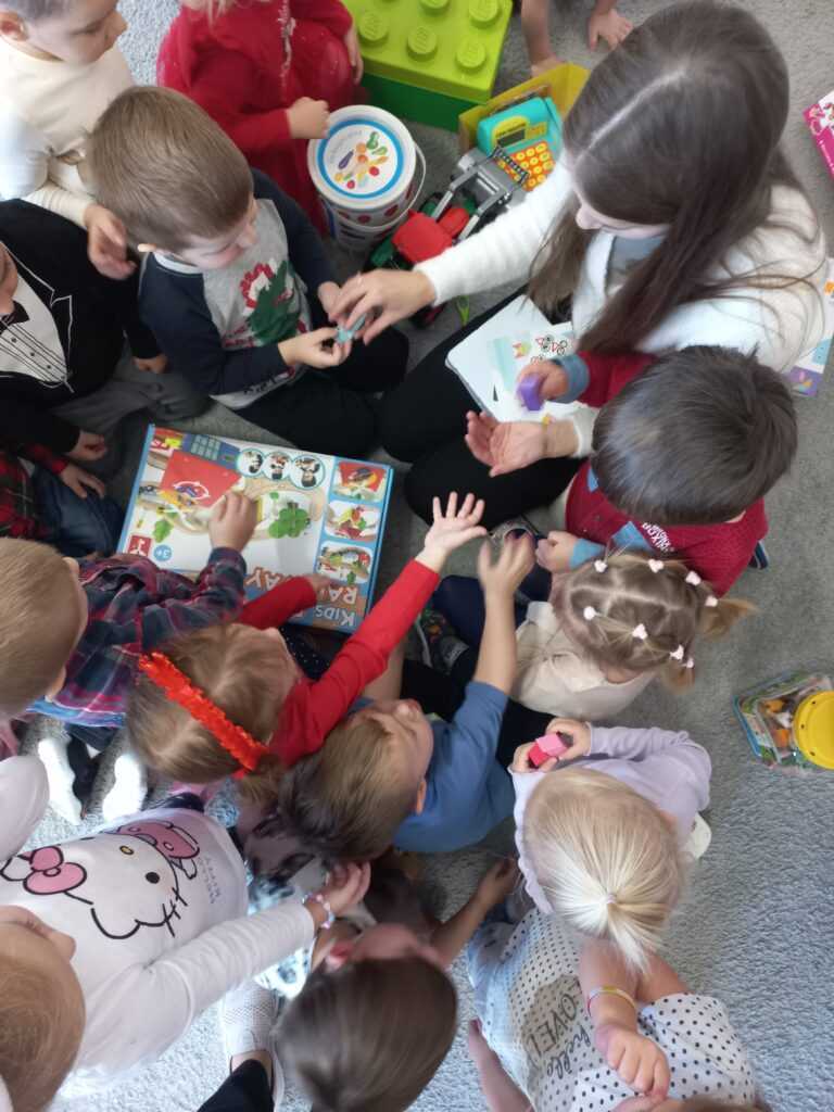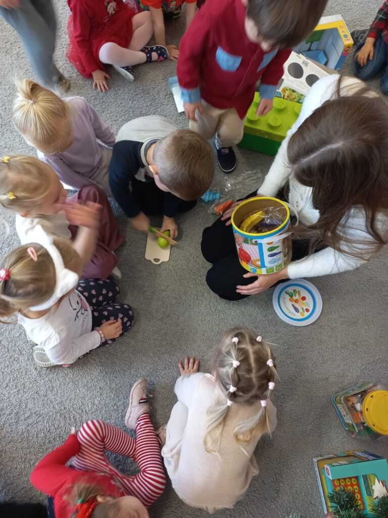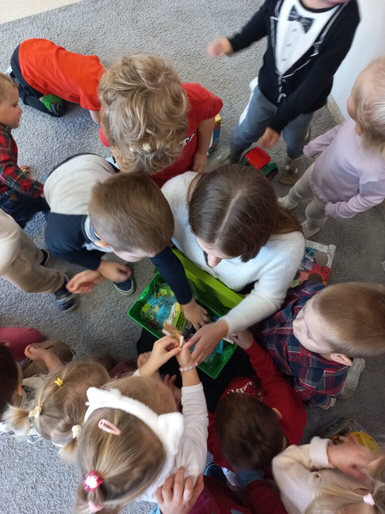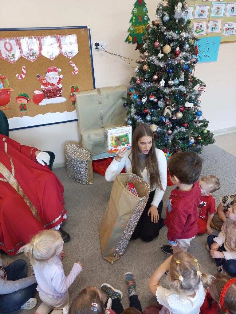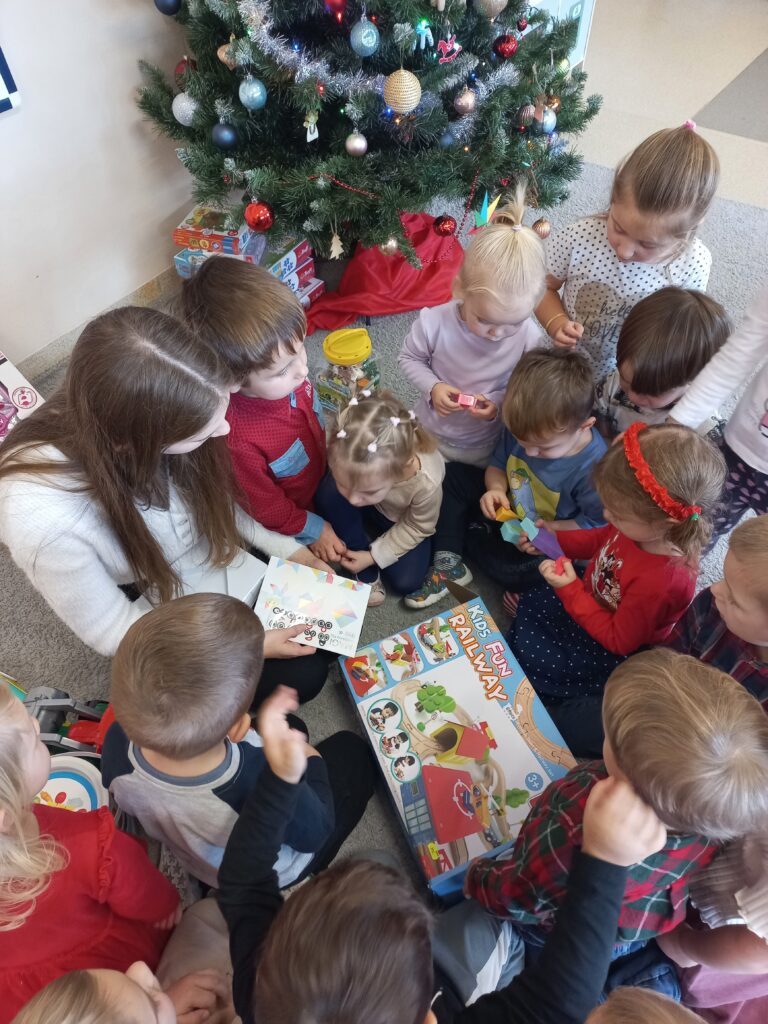 Dzieci po kolei wyjmowały zabawki z worków, z ogromną ciekawością odkrywając, co się w nich znajduje. Radości i uśmiechów nie było końca – przedszkolaki z entuzjazmem otwierały prezenty, oglądały nowe zabawki i od razu zaczęły się nimi bawić.