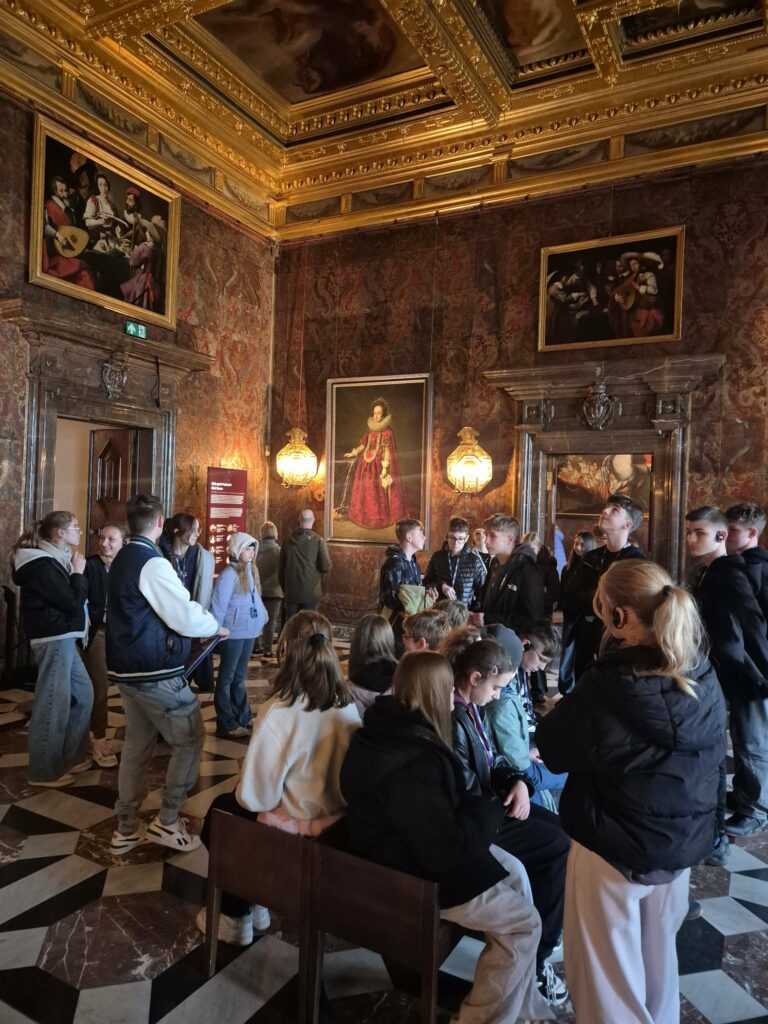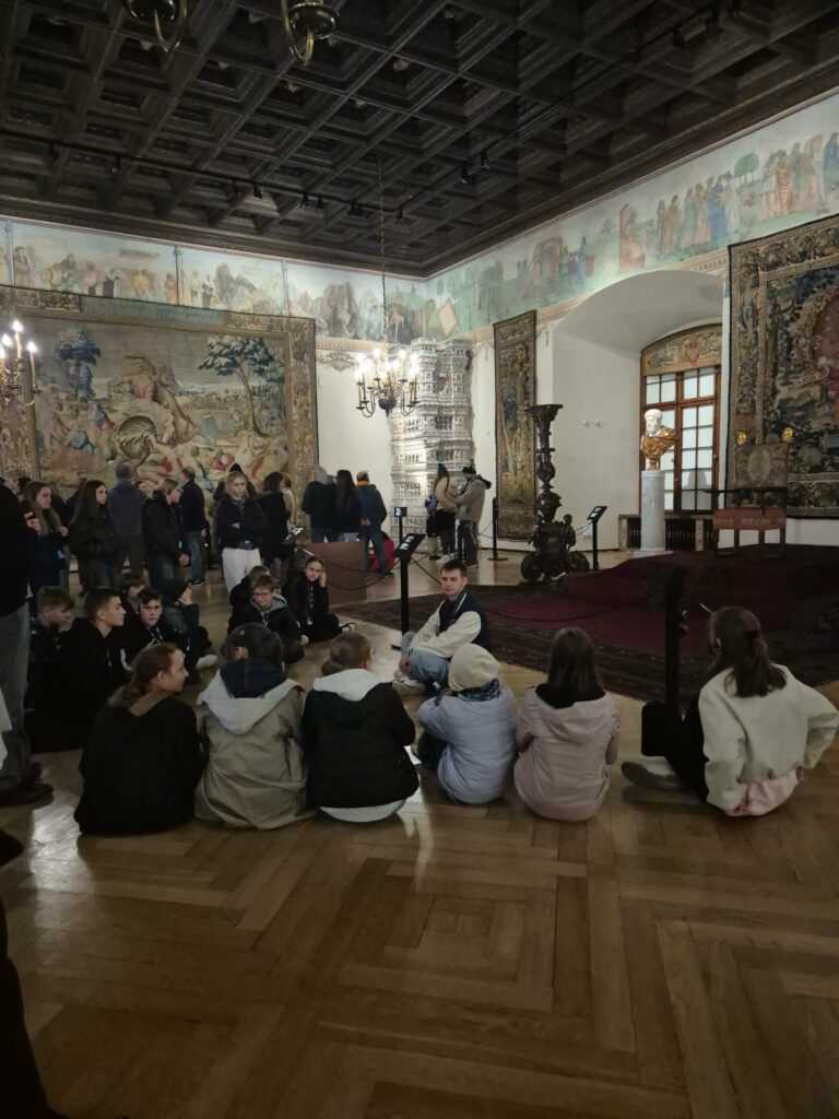 Pierwszym punktem programu była wizyta na Wawelu, gdzie uczniowie wzięli udział w lekcji muzealnej pt. „Renesans na Wawelu”. Na podstawie renesansowych detali, motywów dekoracyjnych, wystroju wnętrz oraz wybranych dzieł uczestnicy zapoznali się z kulturą odrodzenia, czasem i miejscem jej narodzin, a także ze szczególnym znaczeniem mecenatu ostatnich Jagiellonów w epoce, która w polskiej historii nazywana jest złotym wiekiem. Zajęcia odbyły się w salach wystawy „Wawel Zaginiony”, Prywatnych Apartamentach Królewskich, Reprezentacyjnych Komnatach Królewskich oraz na dziedzińcu arkadowym.